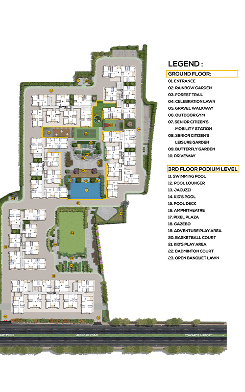 Srijan Spacia is a premium residential project located on Jessore Road, Madhyamgram, beside Reliance Mall, offering excellent connectivity to schools, hospitals, and city hubs. Spread across 3.6 acres with 64% open space, it provides a serene green environment with landscaped gardens and podium-level open areas. The project features an 18,000 sq. ft. clubhouse with modern lifestyle amenities for wellness and recreation. Comprising 6 G+12 towers with 400+ spacious 3 & 4 BHK apartments, it is designed for comfortable, contemporary family living. Srijan Spacia blends connectivity, open spaces, and modern lifestyle to create a refined living experience.